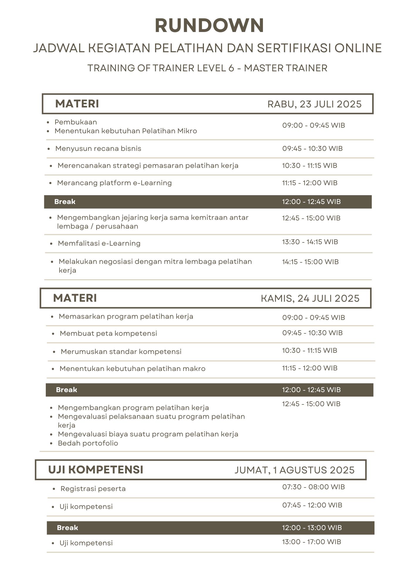 - Pengakuan Profesional: Raih pengakuan resmi sebagai Master Trainer melalui Uji Kompetensi Sertifikasi BNSP pada tanggal 1 Agustus. Sertifikasi ini adalah bukti standar tertinggi dalam industri pelatihan.