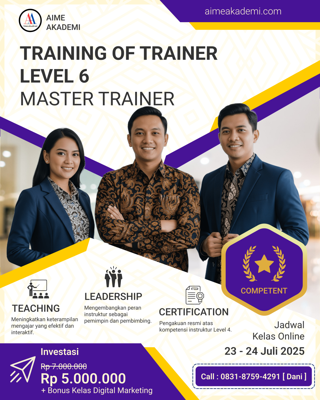 - Manajemen Kelas dan Penanganan Dinamika Kelompok: Dapatkan strategi untuk mengelola berbagai tipe peserta, mengatasi tantangan di dalam kelas, dan membangun kohesi kelompok.